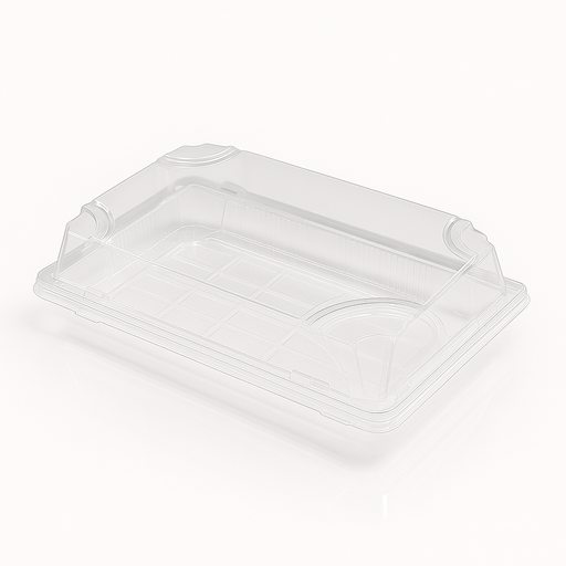 Ce couvercle en PET est conçu pour s'adapter solidement au plateau à sushi en canne à sucre, offrant une vue dégagée et une protection supplémentai...