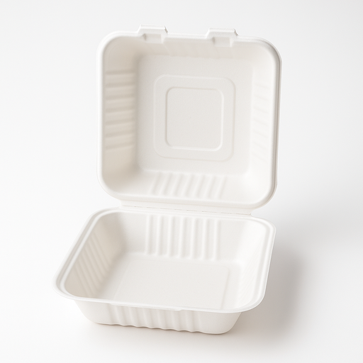 Boîte à hamburger de dimensions 154x154x80 mm en pulpe de canne. Idéal pour les burgers et autres plats de restauration rapide.